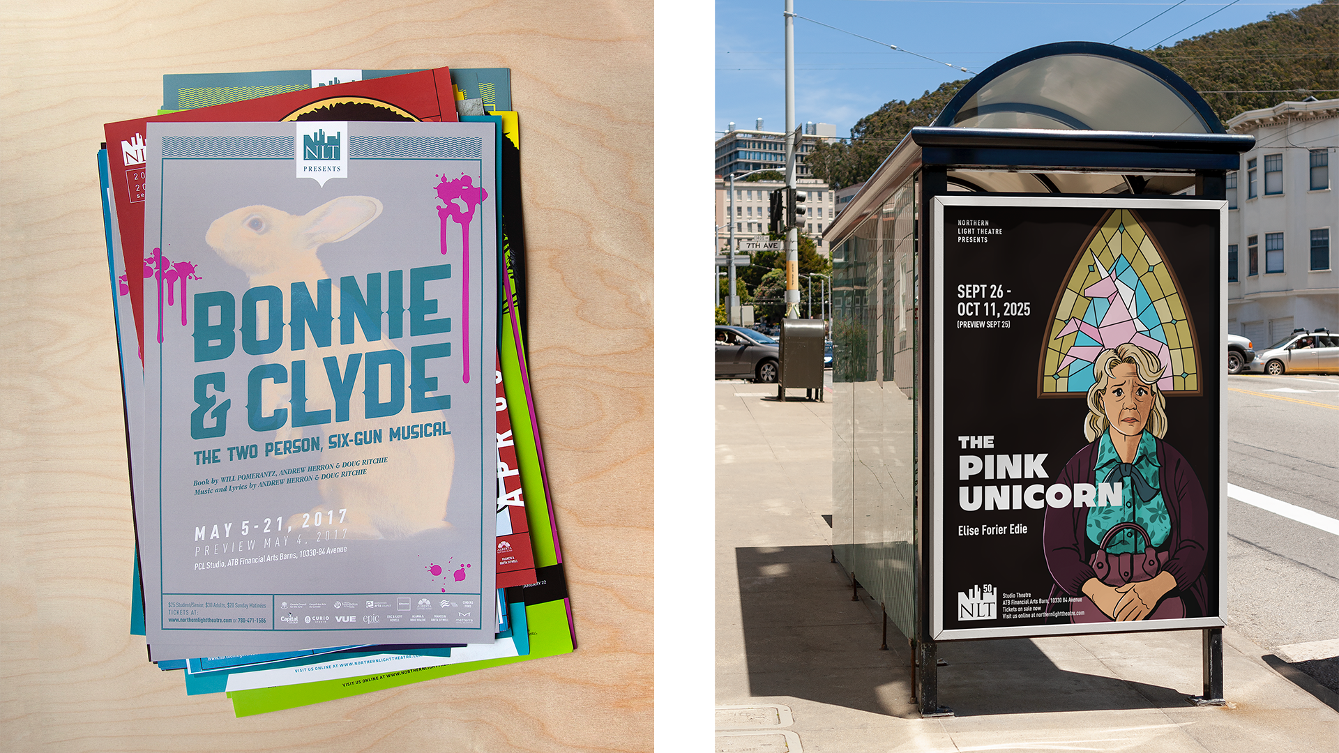 Northern Light Theatre show posters from 2017 (left) and 2025 (right)